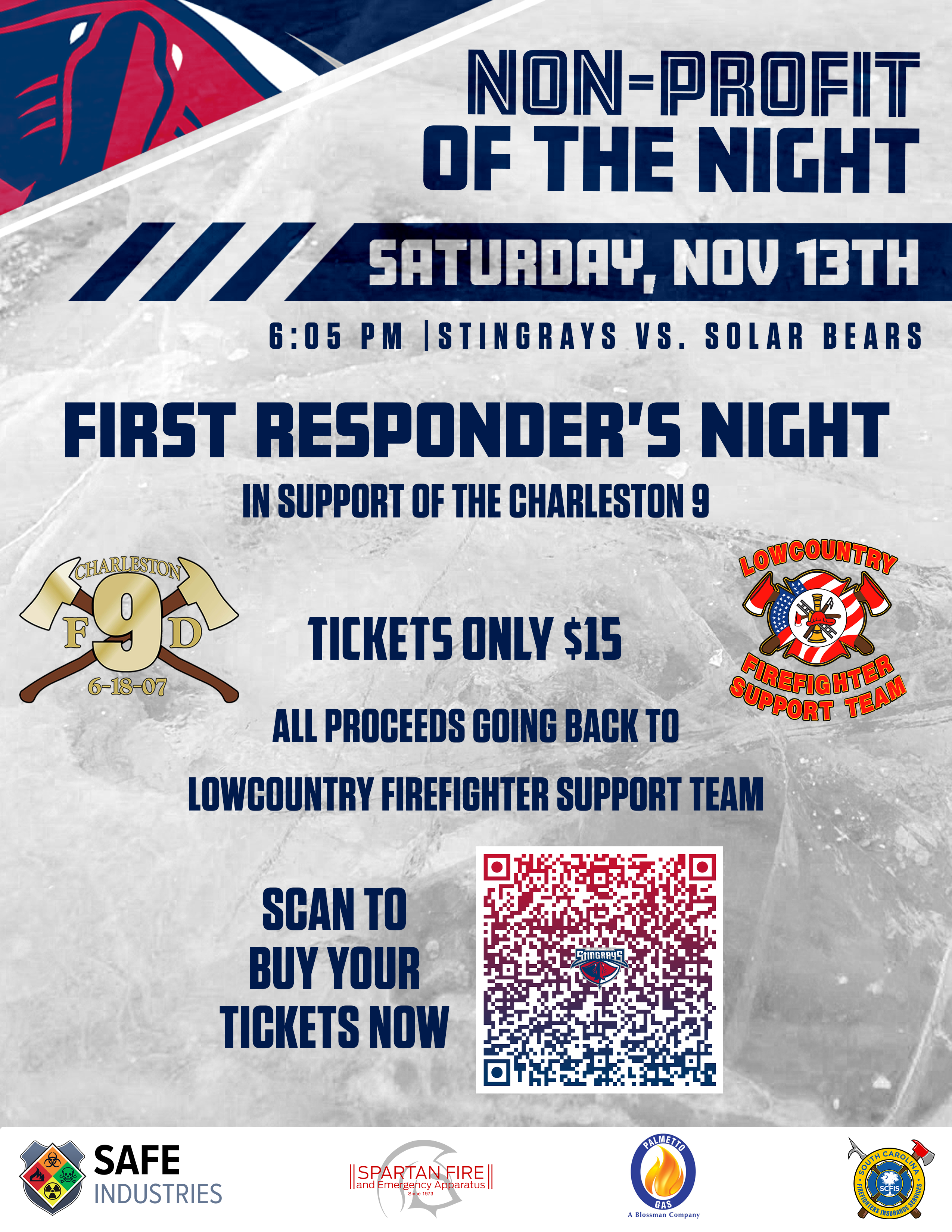 On Saturday, November 13th, our Team will be featured as the Non-Profit of the Night at the Stingrays Hockey game at North Charleston Coliseum. We will honor the Charleston Nine as a part of the program to always “Never Forget”. There will be an auction of jerseys with the names of the Charleston Nine displayed along with game pucks. Scan the bar code here to get your tickets. We hope to see you there. Our Team’s intends to use funds raised from this event to assist in the completion of the engraved brick walkway at the Charleston 9 Memorial Park on Savannah Highway.