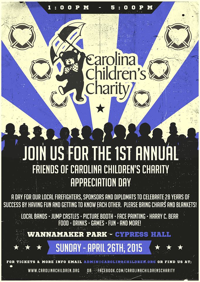 On Sunday, April 26th, the Carolina Children’s Charity will present its 1st Annual Friends Appreciation Day at Wannamaker Park in North Charleston. The event will run from 1:00 p.m. until 5:00 p.m. in Cypress Hall at the park. This will be a wonderful opportunity to get together as a Fire Service family and we hope you all will come. There will be food, fun, games and much more. Email admin@carolinachildren.org for tickets and more information.