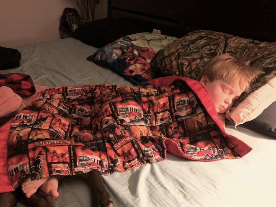 Earlier this week, Kayla mentioned the need for a weighted blanket for Jaxon to help him sleep and to ease his anxiety during his visits to the doctor and hospital. Well, MoJo, who runs our “Operation Zzz” program stepped up and made him a custom fire department blanket fit for a little firefighter.