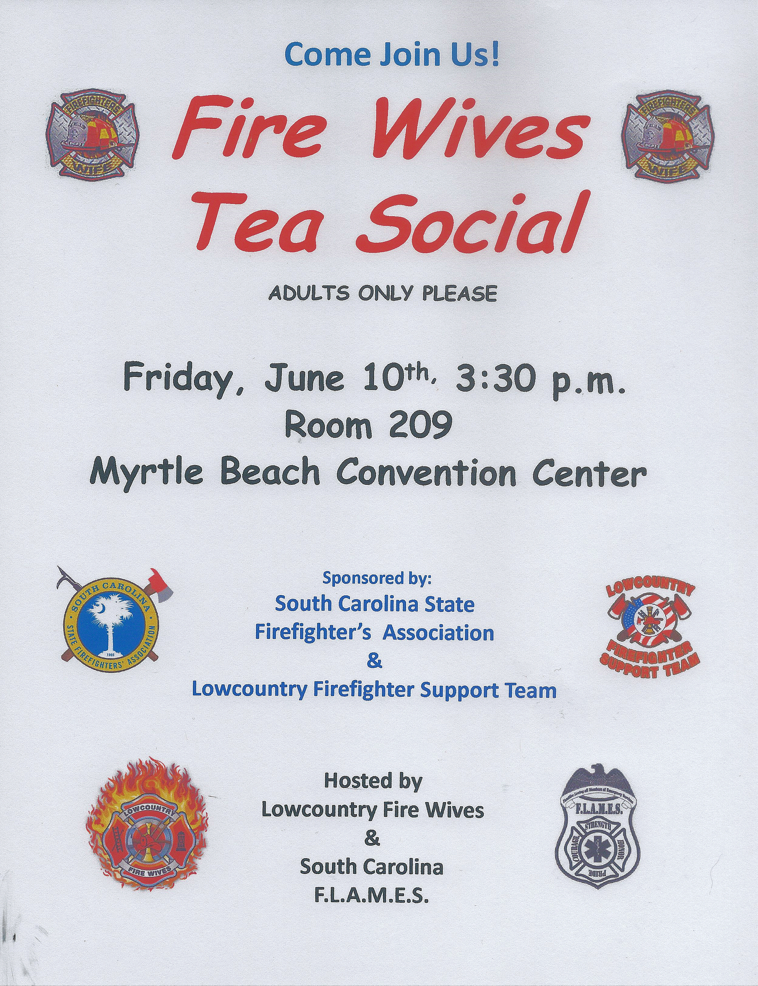 The Lowcountry Fire Wives and the S.C. F.L.A.M.E.S. will host a Tea Social for first responder spouses and significant others during the South Carolina State Firefighters Association’s Fire Rescue Conference in Myrtle Beach.