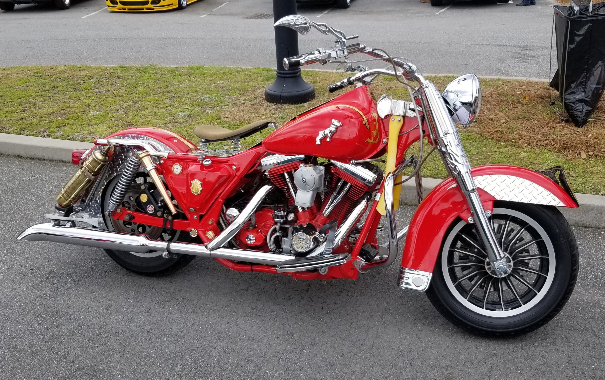 Our Team was excited today to unveil the newest addition to the vehicles we use to support our emergency services personnel in our community outreach program. The 1984 Harley Davidson is owned by our Team Leader, David Reindollar, NCFD Retired. He has owned it for quite some time as he converted it to Fire Service use several years ago. It started out as a police motorcycle before David and his son, Dawson, worked their magic on it. They recently disassembled it and reworked it to what you see here in the photos.