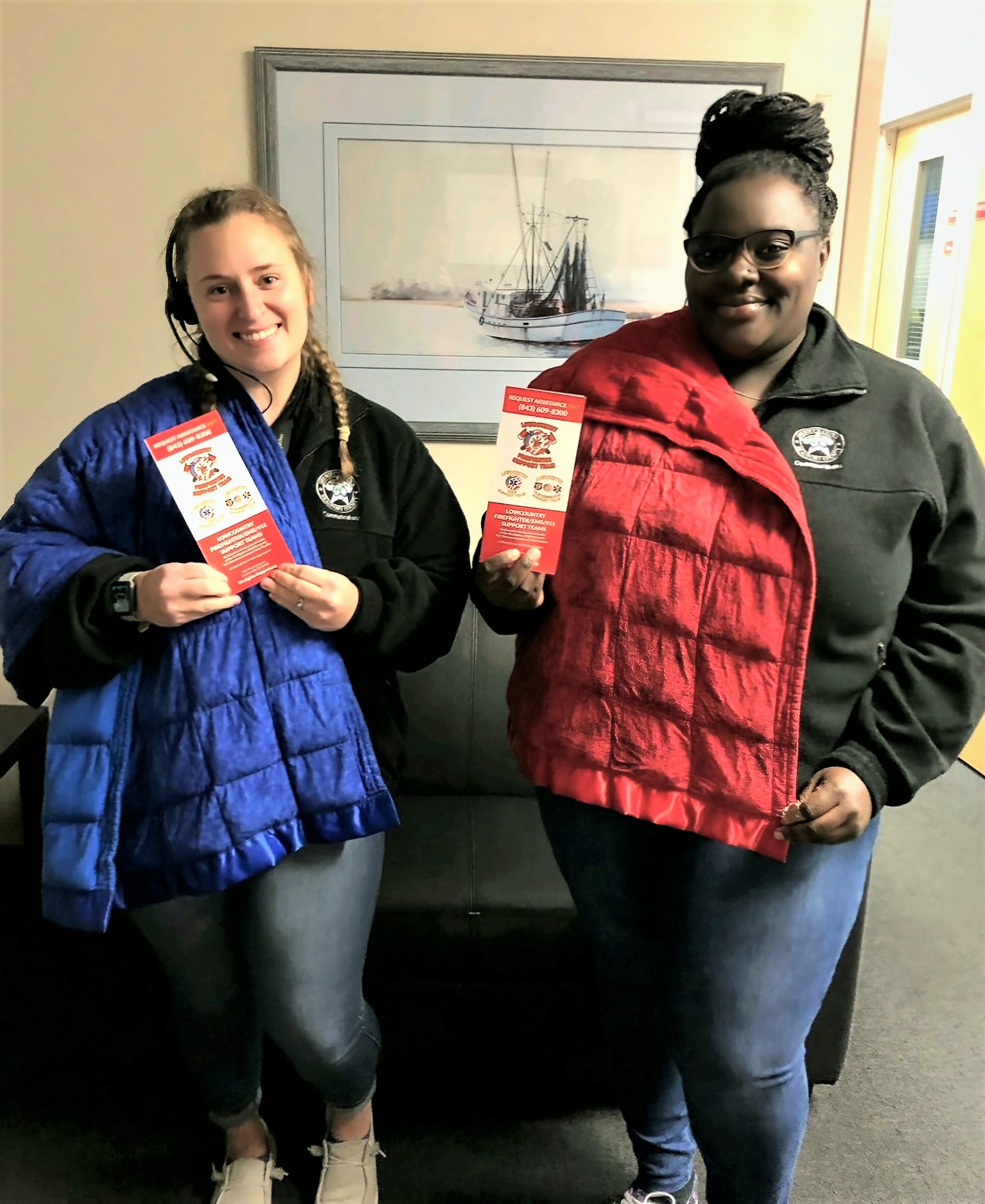 On a recent trip to Bluffton for training, we were happy to provide the Beaufort County Sheriff’s Office Central Communications Center with two of our “Operation Zzz” weighted blankets. Pictured here are Tori Pace and Malaysia Akins, telecommunicators with the BCSO, accepting the blankets.
