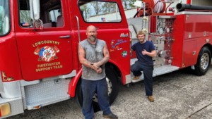 Today was no different as we received help from one of those friends who came to our aid. Last Friday, while traveling with our Road Runner Mack to the Veteran ‘s Victory House Christmas Parade, we suffered a blown tire in Cottageville. We stopped at the Genesis Auto Sales where we were allowed to leave the truck there until after the parade. The folks there called all their contacts to try to find a tire for us while we went on to Walterboro for the parade. When we returned, they had not been able to locate a tire due to the size and age of the old one. After a call to Chief Barry McRoy in Colleton County Fire Rescue, he sent the CCFR mechanic and a Battalion Chief to help us. Since we had one tire still up, we decided to drive slow and limp it to Hill Tire in Walterboro.